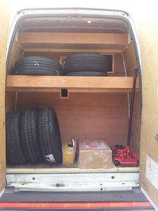van before any work is carried out, and then put back before moving onto the next job. To overcome this time consuming and frankly annoying setback we created a separate storage compartment, accessible from the back of the van, which is perfect for storing tyres out of the way. We added several storage compartments for tools boxes and consumables as well as a work bench which can be folded away to create even more work space.