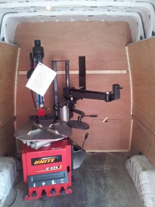 only having room for a smaller, semi automatic tyre changer which not being designed to cope with low profile or run flat tyres can result in having to turn crucial customers away. Larger, fully automatic machines are usually over looked for a mobile van because of their rear tilting column and wide assist arms taking up precious working space. However with precise measurements and a well thought out design we were able to install the Unite U226, a 24″ fully automatic tyre changer complete with assist arm, which is fully capable of changing low profile and run flat tyres.