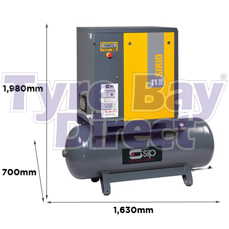 The SIP Sirio 11-10-500 is a powerful screw compressor with an IE3 motor, ETM II electronic controller for detailed system readings, and a POLY-V belt drive system for efficiency and life.