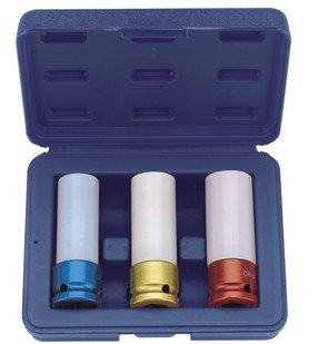 Back to TopSet of three 6 point sockets sizes 17, 19 and 21mm. Manufactured from chrome molybdenum steel hardened and tempered. Sleeved with nylon internally and externally to prevent damage to wheels and nuts. Supplied in handy blow mould case with display sleeve.